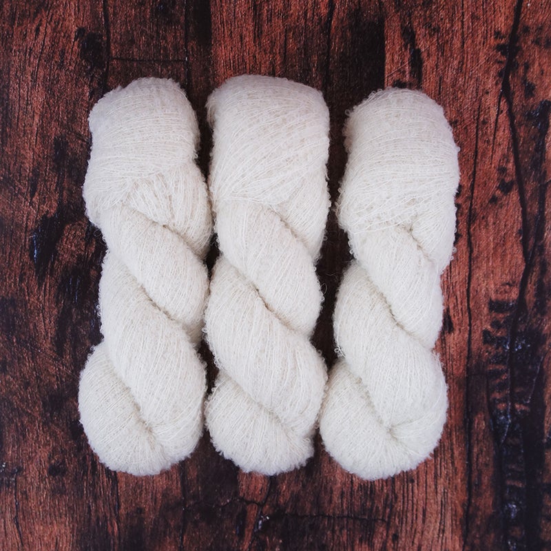 It can also be used to bring texture alongside a fingering weight yarn, or knit triple for a thick, fluffy, soft fabric.